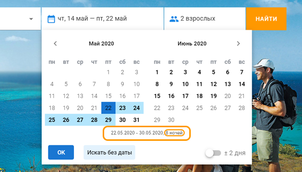 Изменился ввод дат тура и стал более удобным. Даты начала и окончания можно выбрать одним движением мышки, а также можно расширить на +/- 2 дня.