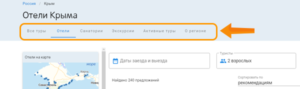 На странице направления собраны все типы туров: лечение в санаториях, экскурсионные туры, активный отдых и отели. Вам нужно выбрать лишь нужный вид тура, желаемые даты и продолжить поиск в этом же окне поиска.