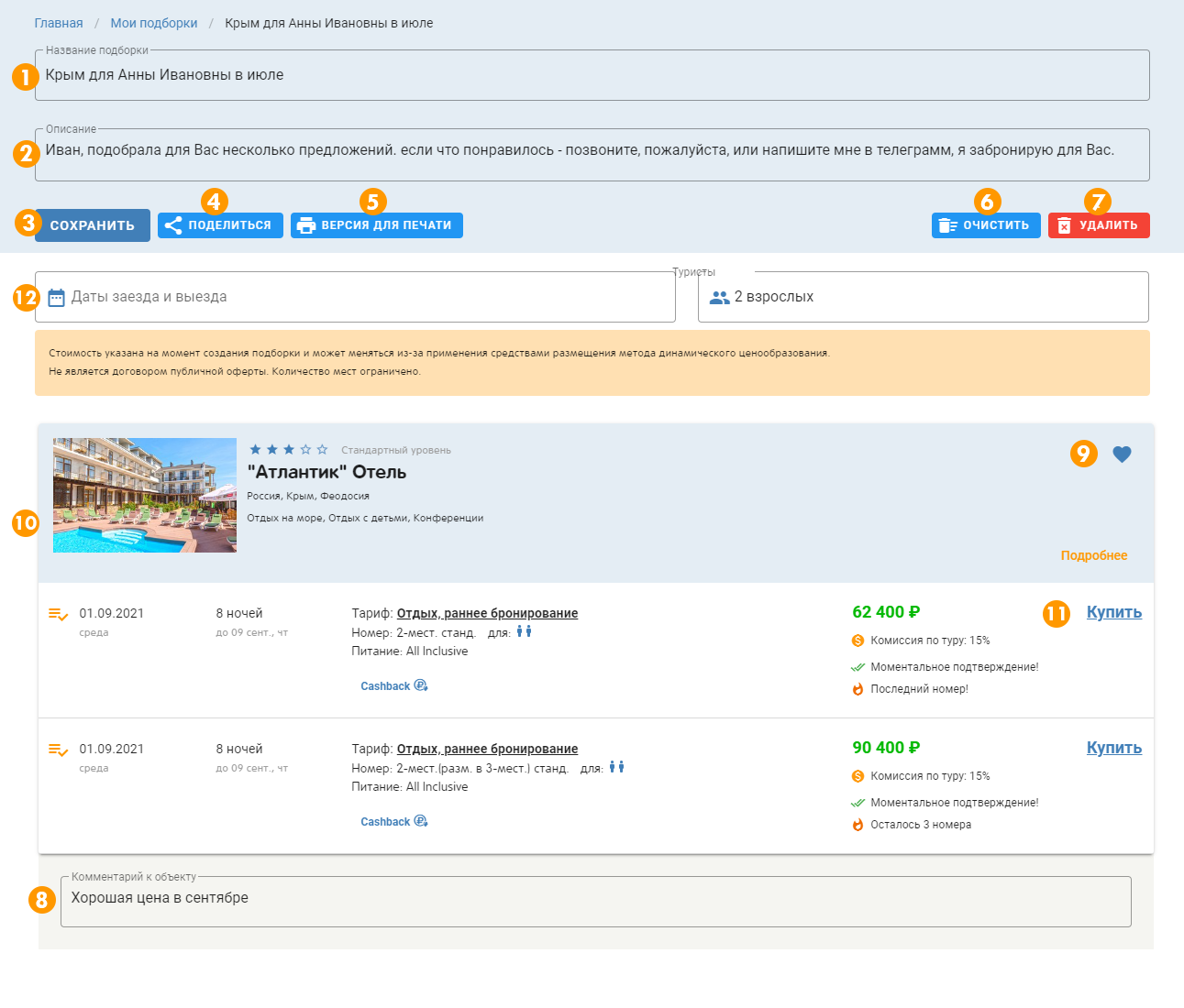8. Добавить комментарий к каждому отелю или туру в подборке – поле «комментарий к объекту»