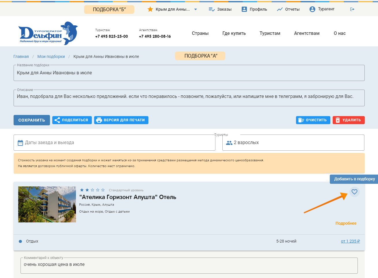 Важно – добавление ценового предложения в подборку автоматически помещает отель, тур в подборку.