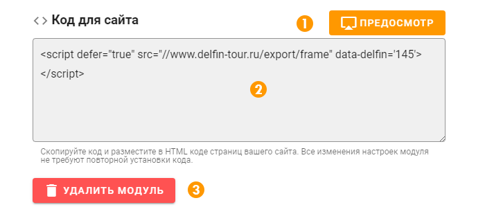 2. Код для сайта. Скопируйте код и разместите в HTML коде страниц вашего сайта. Все изменения настроек модуля не требуют повторной установки кода;