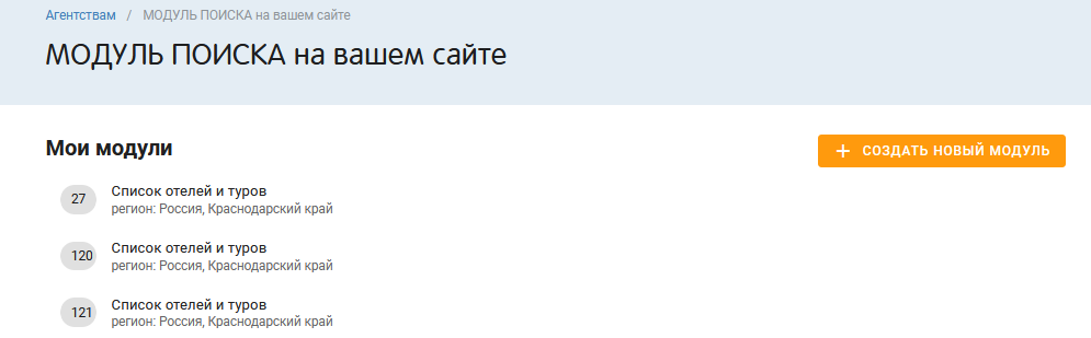 1. В типе модуля выберете «СПИСОК ОТЕЛЕЙ И ТУРОВ».